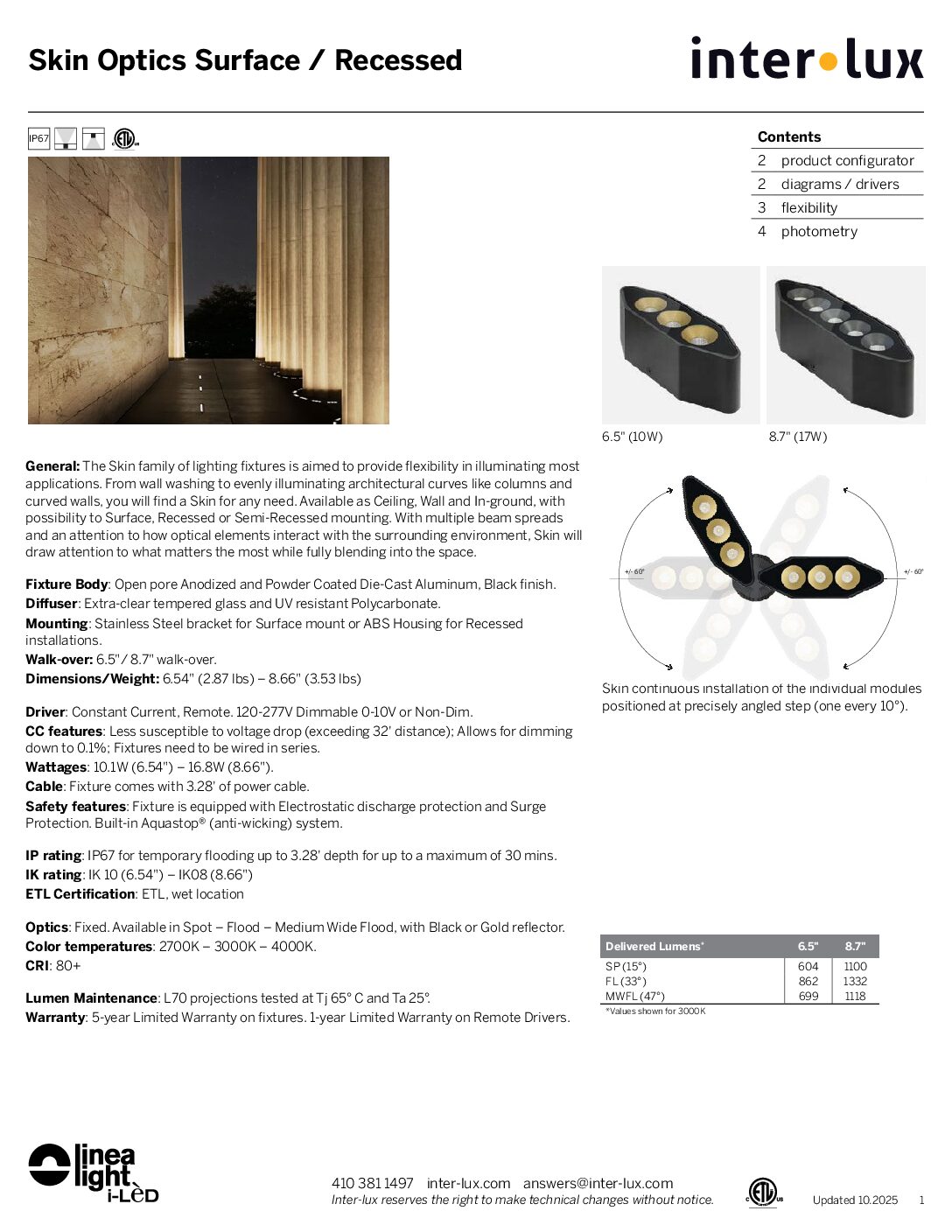 The Skin family of lighting fixtures is aimed to provide flexibility in illuminating most applications. From wall washing to evenly illuminating architectural curves like columns and curved walls, you will find a Skin for any need. Available as Ceiling, Wall and In-ground, with possibility to Surface, Recessed or Semi-Recessed mounting. With multiple beam spreads and an attention to how optical elements interact with the surrounding environment, Skin will draw attention to what matters the most while fully blending into the space.