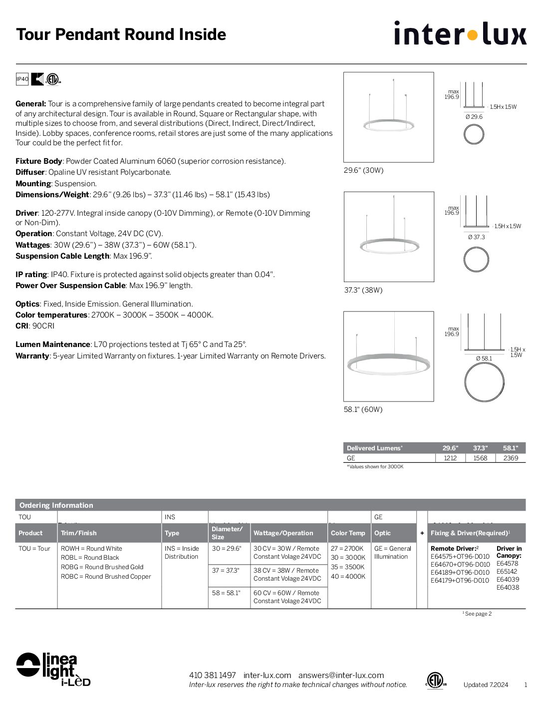 Tour is a comprehensive family of large pendants created to become integral part of any architectural design. Tour is available in multiple sizes, and several distributions (Direct, Indirect, Direct/Indirect, Inside). Lobby spaces, conference rooms, retail stores are just some of the many applications Tour could be the perfect fit for.