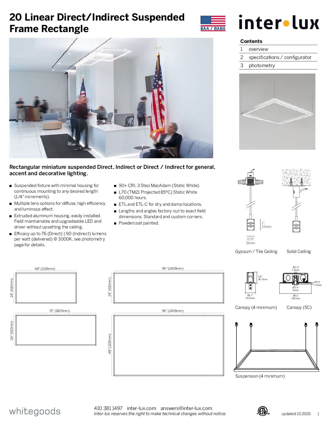 - Suspended fixture with minimal housing for continuous mounting to any desired length (1/4″ increments).