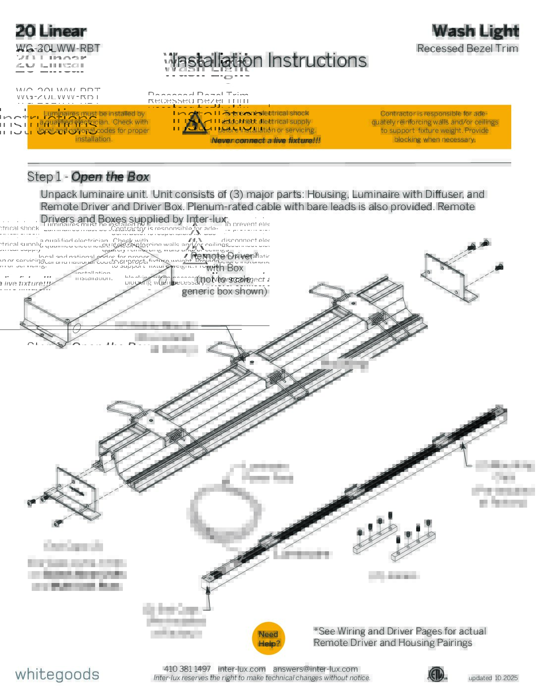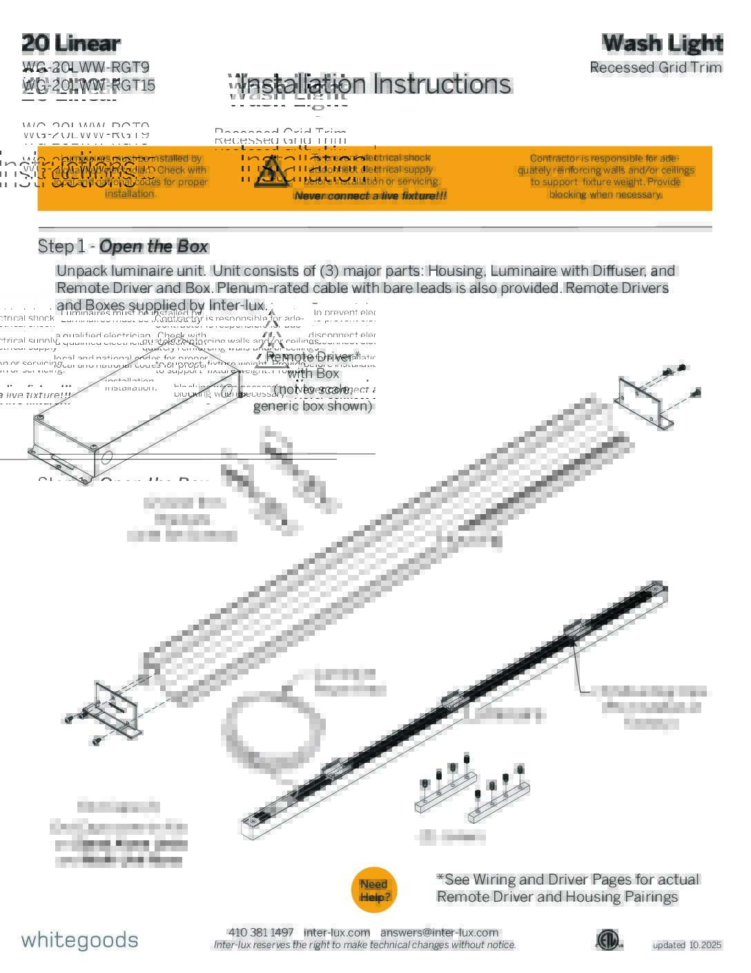 - Semi-recessed wash light with very shallow depth for continuous mounting to any desired length (1/4″ increments), as well as standard grid multiples.