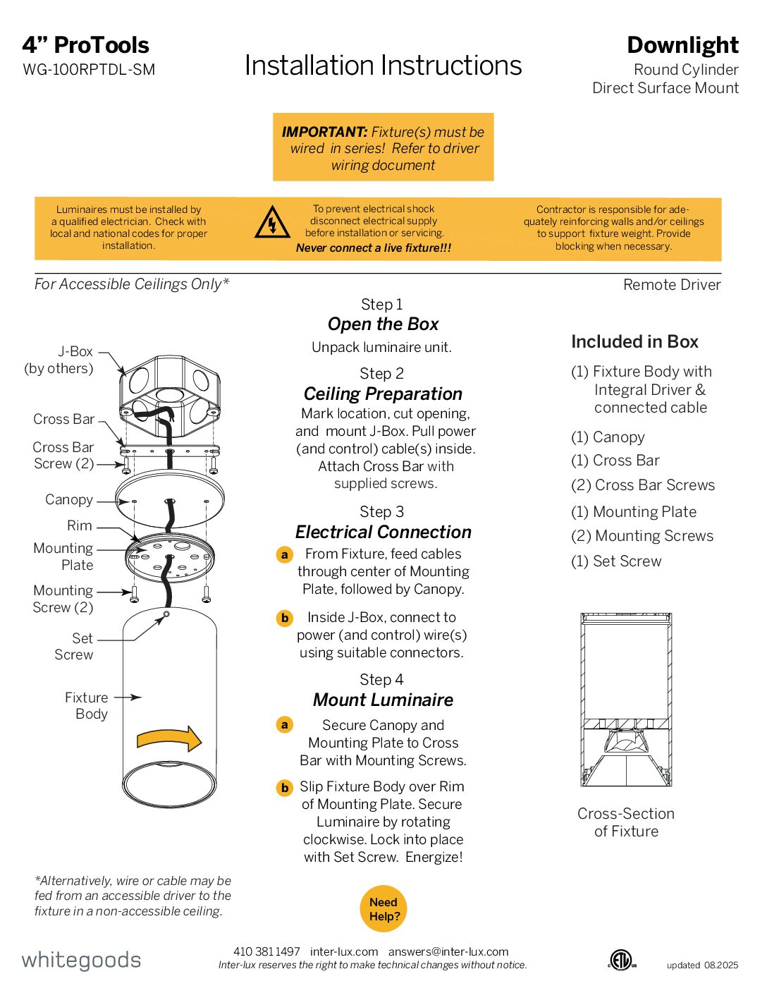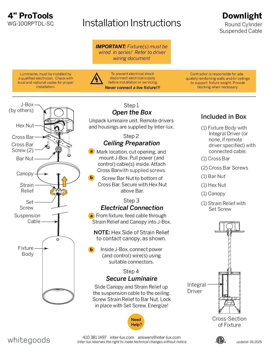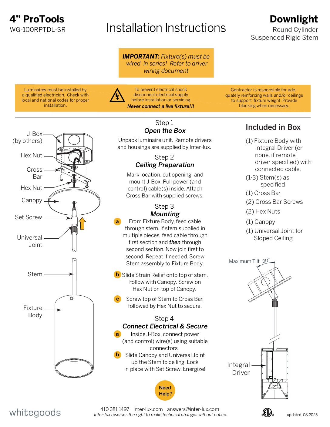 - 4″ round ceiling mounted cylinder downlight with wide range of beam angles and lens options available to fit a multitude of applications.