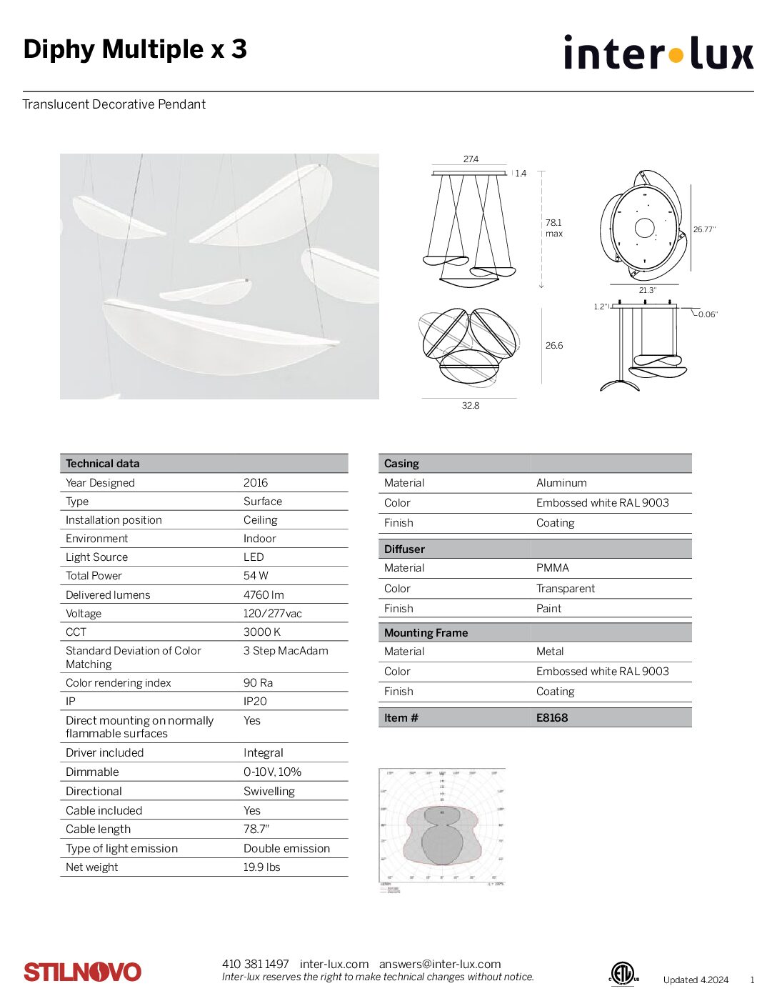 Diffuser in transparent laser micro engraved PMMA with OptiLight™ technology and thermal-bent. Central body in white painted aluminium, dimmable topLED source with controlled emission and high visual comfort. Ceiling rose in white painted metal. Support/conductor cables in steel.