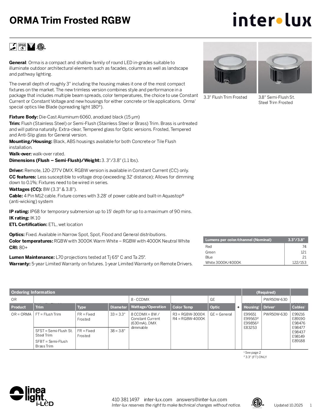 Driver: Remote, 120-277V DMX. RGBW version is available in Constant Current (CC) only.